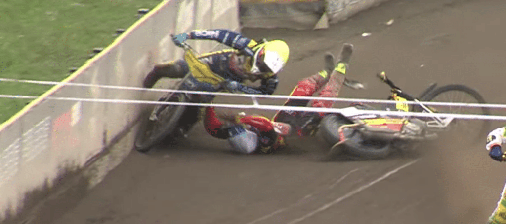 W biegu prowadził Kowolik. Młodzieżowiec Betard Sparty Wrocław na wyjściu z drugiego łuku jednak popełnił błąd. Zdjął nogę z haka, po czym momentalnie stracił kontrolę nad motocyklem i upadł na tor. Jadący za nim Kevin Małkiewicz próbował go ominąć, ale był za blisko, by manewr ten się powiódł. Przejechał on po zawodniku Sparty, zahaczając nawet o jego głowę. Po tej nieudanej akcji ratunkowej Małkiewicz sam groźnie upadł na tor, odbijając się od drewnianej bandy na prostej startowej.