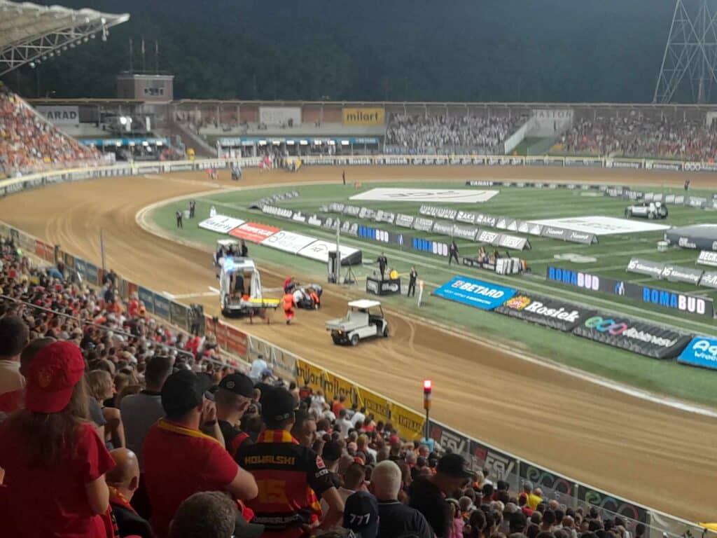 Janowski upadł na plecy, ale to nie to było najgorsze. Kierownica spadła mu na prawą nogę i to właśnie ona może być kontuzjowana. Lider Betard Sparty Wrocław zwijał się z bólu i na noszach został wniesiony do karetki. W niej opuścił też tor.