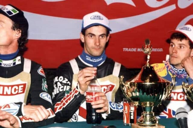 1995 rok – Tomasz Gollob zwycięża swój pierwszy turniej w cyklu SGP. We Wrocławiu staje na pierwszym miejscu podium i zdobywa 20 punktów. Na zdjęciu z Hansem Nielsenem (po lewo) oraz Chrisem Louisem (po prawej). W tym samym sezonie zdobywa kolejny tytuł IMP.