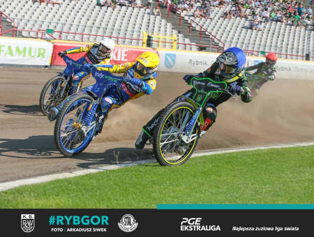 W wyścigu piątym ponownie za Andrzeja Lebiediewa ujrzeliśmy Roberta Lamberta. Brytyjczyk najlepiej wyszedł spod taśmy i nie oddał prowadzenia do końca. Show na pierwszym łuku zrobił natomiast Siergiej Łogaczew. Rosjanin startując z czwartego pola przedłużył prostą, spojrzał co się dzieje na wewnętrznej i fantastycznym atakiem wyprzedził zarówno Iversena i Thomsena. Rekiny pewnie triumfowały i to oni tym razem objęli dwupunktowe prowadzenie! Kibice przy ul. Gliwickiej 72 ożywili się i gromkimi brawami nagrodzili postawę swoich zawodników. Szóste rozdanie punktowe rozpoczęło się od atomowego startu pary Woźniak-Kasprzak. Kacper Woryna jeszcze na pierwszym okrążeniu napędził się po zewnętrznej na tyle, że bez problemu minął Woźniaka, lecz na popularnego KejKeja to nie wystarczyło i zanotowaliśmy 4:2 dla gorzowian, a w całym meczu 18:18. W gonitwie 7. po dobrym rozegraniu pierwszego łuku rybniczanie objęli podwójne prowadzenie. Za plecami mieli jednak fantastycznie dysponowanego tego dnia aktualnego mistrza świata. W niecałe dwa okrążenia Zmarzlik przedarł się na pierwszą pozycję i nie pozostawił złudzeń gospodarzom na coś więcej niż biegowy remis. Po siedmiu starciach obie ekipy uzbierały po 21 punktów.