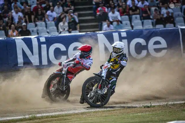 Już w pierwszym wyścigu mieliśmy do czynienia z problemami z maszyną startową. Taśma poszła nierówno, jednak na szczęście w późniejszej fazie spotkania nie sprawiała kłopotów. Pierwsza seria dla gospodarzy 14:10, dwukrotnie padał wynik 4:2, w którym trójkę do mety przywoził Wiktor Przyjemski. W biegu szóstym na tor upadł Olivier Buszkiewicz oraz Luke Becker. Amerykanin więcej już w tym spotkaniu nie wystąpi, ponieważ udał się do szpitala z podejrzeniem złamania ręki. Bardzo dobrze dziś dysponowany jest Mateusz Szczepaniak i dzięki niemu Polonia powiększa przewagę po drugiej serii do sześciu punktów.