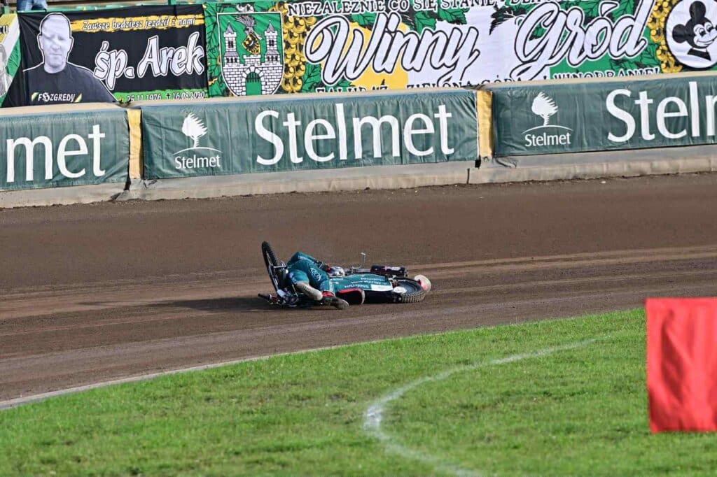Młodzieżowiec wypożyczony z Fogo Unii Leszno nie opanował motocykla podczas drugiego wyjazdu na próbę toru i uderzył bardzo mocno o tor i leżał nieruchomo na nim, co wyglądało bardzo poważnie. Po upadku młodzieżowiec był nieprzytomny i od razu przy nim pojawiła się karetka. Po chwili został do niej zabrany na noszach i na sygnale udała się ona do szpitala.