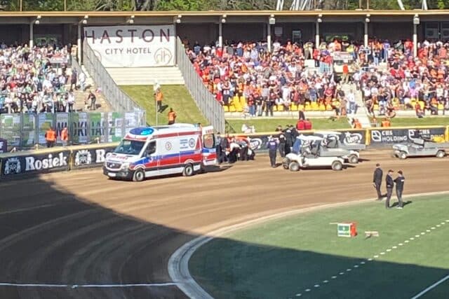 Na początku drugiej serii startów doszło do niebezpiecznego upadku Kacpra Woryny. Zawodnik gości po wyprzedzeniu przez Artioma Łagutę delikatnie odprostował motocykl i zahaczył o tylne koło jadącego po zewnętrznej Piotra Pawlickiego. Wychowanek rybnickiego ROW-u wpadł pod bandę, a dodatkowo uderzył jeszcze w swój motor.