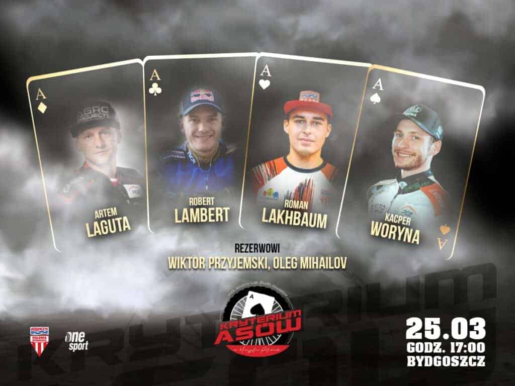 Mistrz Świata, Artem Laguta w obsadzie XXXIII Kryterium Asów Polskich Lig Żużlowych. Abramczyk Polonia Bydgoszcz podała ostatnia czwórkę uczestników którzy zmierzą się w przedsezonowym turnieju na torze w Bydgoszczy. Oprócz startu Indywidualnego Mistrza Świata ogłoszono: Roberta Lamberta, Romana Lakhbauma oraz Kacpra Worynę.