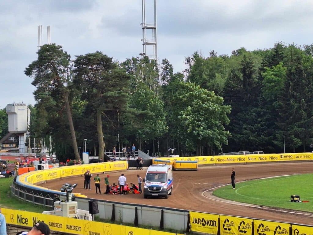 Podczas Drużynowych Mistrzostw Polski Juniorów w Poznaniu doszło do bardzo groźnie wyglądającego upadku dwójki zawodników. Jeden z nich został przetransportowany w karetce do szpitala.