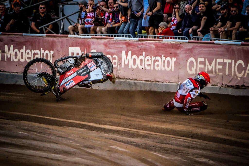 Kilka chwil później w biegu dwunastym tym razem na torze leżał Szymon Woźniak. Przy 5:1 dla gości na ostatnim łuku Indywidualny Mistrz Polski 2017 nie opanował motocykla i zahaczył o dmuchaną bandę. Przez dłuższy moment nie podnosił się z toru, ale na szczęście o własnych siłach udał się do parkingu.