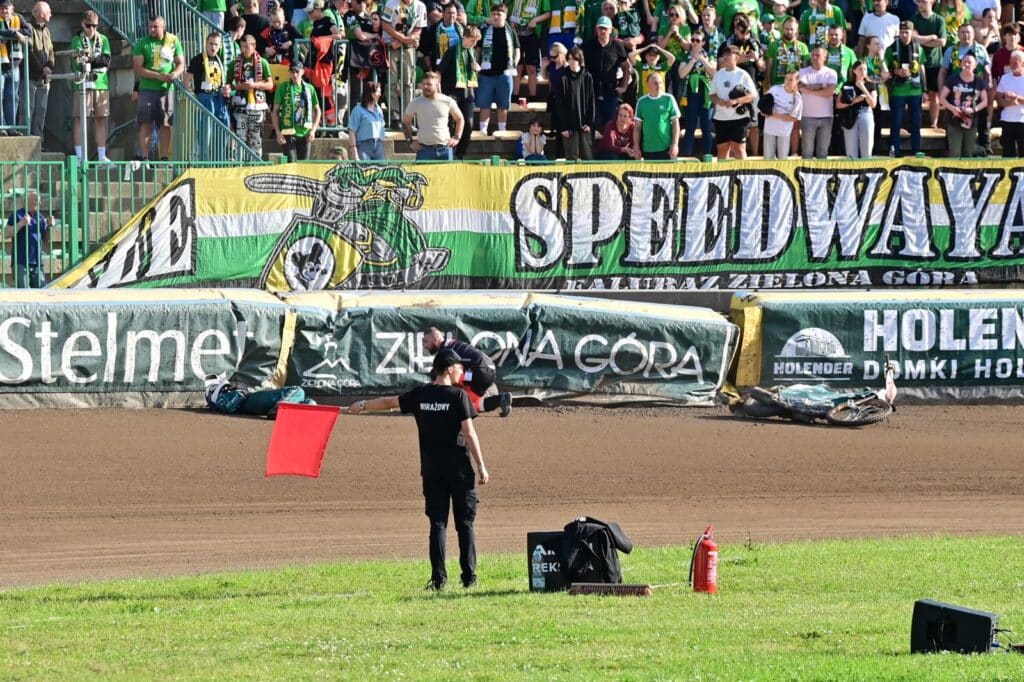 Obaj zawodnicy przez chwilę leżeli na torze, co tylko potęgowało napięcie. Po chwili Oskar Hurysz wstał o własnych siłach, co przyjęto brawami. Gorzej wyglądała sytuacja z Pawłem Trześniewskim – przez moment nie było wiadomo, czy nie odniósł poważniejszych obrażeń. Ostatecznie został zabrany do parku maszyn, gdzie udzielono mu pomocy medycznej.