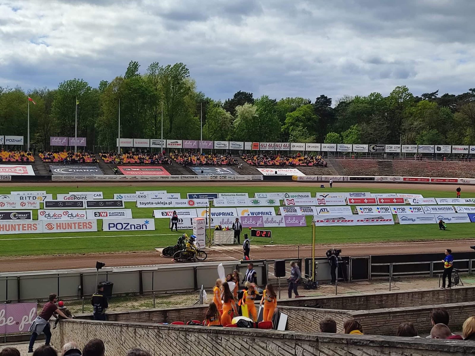 Spotkanie rozpoczęło się od wyniku 3:3 zwyciężył powracający do składu gospodarzy Aleksandr Łoktajew, a upadek jadąc na trzeciej pozycji zanotował Norbert Krakowiak. W biegu numer trzy przy stanie 5:1 dla gości z nawierzchnią zapoznał się Adrian Gała. Wychowanek Startu Gniezno jest niezdolny do dalszej jazdy. Pierwsza seria kończy się wynikiem na remis. W przerwie trwały pracę nad drugim łukiem przez co wydłużyło oczekiwanie na kolejny wyścig. Po raz kolejny na torze nie pojawił się Krystian Pieszczek, zmienił go rezerwowy Jan Kvech, a niezdolnego Adriana Gałę zastępować będzie Emil Breum. Goście w drugiej serii wychodzą na dwupunktowe prowadzenie.